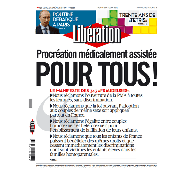 C’était le jour du 70e anniversaire du Débarquement. Alors que tous les médias consacraient leur Une à cette journée historique le 6 juin dernier, Libération avait, lui, décidé de titrer Procréation médicalement assistée pour tous ! Un contre-pied qui, justement, a permis de mettre la lumière sur une réalité encore niée : l’inégalité devant la PMA. Le quotidien relayait ainsi Le manifeste des 343 fraudeuses, en allusion au Manifeste des 343 salopes qui avaient révélé avoir avorté avant que ne soit légalisée l’interruption volontaire de grossesse. Aujourd’hui, ces femmes, homosexuelles, hétérosexuelles, en couple ou célibataire, déclarent publiquement avoir eu recours à une PMA à l’étranger pour pouvoir avoir un enfant.